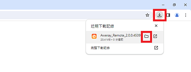Step 2等待下載完成後,點擊Chrome瀏覽器右上角的 ,滑鼠移到下方並點擊 開啟下載資料夾