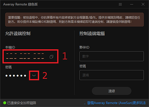 Step 5請將1號紅框中的【本機ID】給予工程師,2號紅框點一下可以顯示【密碼】,再點一下可以關閉